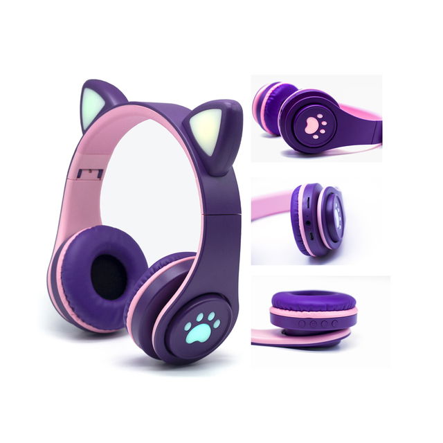 Auriculares con diseño exclusivo de gatito, luces led y controles en los headphones. Disponible en varios colores, conexión a través de bluethoot, se pueden plegar y es compatibles con cables tipo - c.