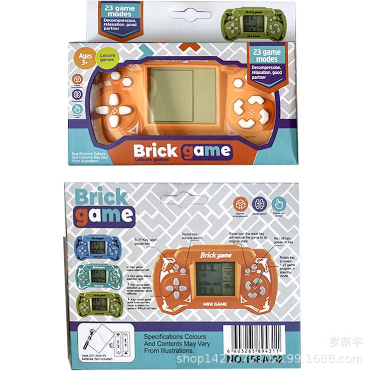 Consola de video juegos importada portatil que funciona con 2 pilas AA (no incluidas) Incluye 23 juegos retro como Tetris y otros . La pantalla NO es a color. Consola plastica liviana y facilmente transportable que mide 14,5 x 8,5 x 2,5 cms, y la pantalla mide 4,5 x 4 cms. Viene en tres colores para elegir: Azul claro, Verde, Naranja y Celeste.